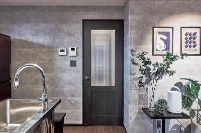 コンクリート調の壁面に馴染むスイッチ・コンセント。ブラックオーク色のドアが空間のアクセントに。