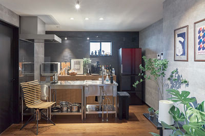 カフェを経営するH様が使い慣れた業務用キッチンを採用。背面のアクセントクロスがキッチンをアートのように際立たせます。