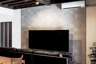 電球色のスポット光で照らし上げたグレーの壁面。印象的でありながらも、陰影が美しく、落ち着ける空間に。