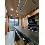 天井から床までの大容量カップボードでスッキリ収納。扉を閉めれば重厚な家具調が空間にマッチ。並ぶと狭くなりがちなシンクも三方向から使えます。