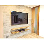 リビングのTV背面は調湿+脱臭機能がある内装材を貼りました。お部屋のアクセントと共に生活臭やペットの気になるニオイ対策としても◎
