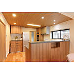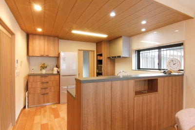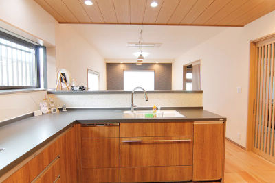 吊り戸はなくし家族が見渡せるようにしました。L型の作業スペースは広々使え、4世代一緒に料理が楽しめます。