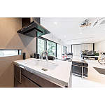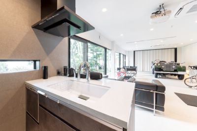 ブロンズグリーンの愛車が映えるモダンな空間。キッチンからは四季折々の庭の様子も眺めることができます。