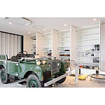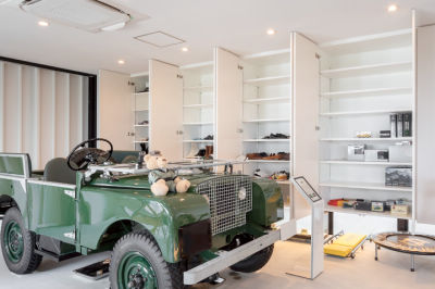 ブロンズグリーンの愛車が映えるモダンな空間。キッチンからは四季折々の庭の様子も眺めることができます。