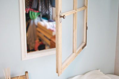 隣接するウォークインクローゼットとの間にヴィンテージの室内窓を設置。ブルーの壁紙ともマッチ。