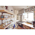 カラフルなタイルで彩り、明るく楽しい雰囲気のキッチンに。背面には使い勝手のよいオープンスタイルの食器棚を設置しました。