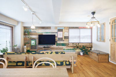 K様が丹念に選ばれた、色や形、サイズもさまざまな古材を、打ち合わせしながら壁一面に取り付けました。