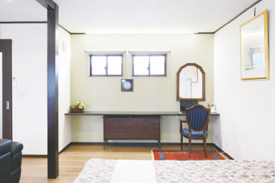 寝室にパソコンデスク兼ドレッシングスペースとしてカウンターを設置。壁紙をグリーンにして明るい雰囲気に。