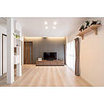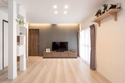 キッチン横の和室と廊下を取り込んでリビングに。テレビ台とドアをウォールナット色でそろえ、音楽を楽しめるスピーカー付ダウンライトと間接照明でくつろぎ感を演出。