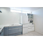 通りからの視線を考慮して高窓を採用。冷蔵庫や高さのあるカップボードを設置しても隠れません。