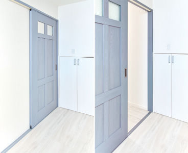 「クラフトレーベル」の建具はキッチン扉柄と色を合わせました。下枠までカラーを統一したことで、ドアを開けていても廊下との境界線をさりげなく演出。