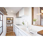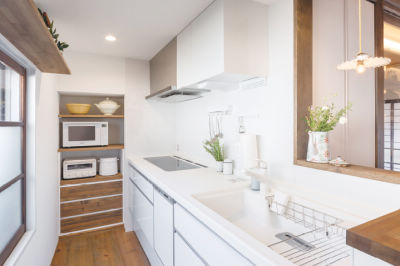 キッチンはリビングからの視線を遮るカウンター付きの棚を設置しました。