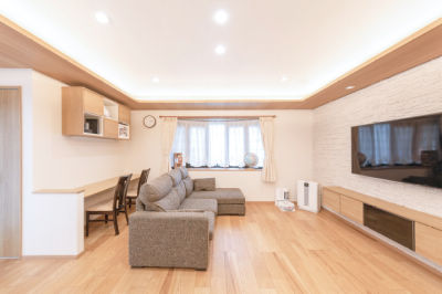 折り上げ天井で開放感を高めたLDK。オープンスタイルのキッチンは、作業していてもお子様の様子にしっかり目が届きます。