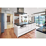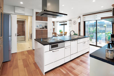 キッチンからつながる植栽が美しいウッドデッキ。目隠しの格子は圧迫感が少なく、外からの視線を遮りつつ、光と風を通します。