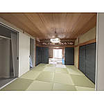 縁がない半畳畳を採用し、スタイリッシュな見た目に。建具は藍墨色の襖で既設の欄間とのバランスを考え、落ち着いた雰囲気を目指した。