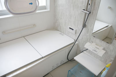 浴室の向きを変えた事で、大きな鏡も設置でき壁面を有効的に使うことができるようになりました。浴室の段差解消やタイルからパネルの壁になったことでお掃除しやすい浴室になっています。