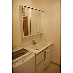洗面化粧台と洗濯機の位置を並列にすることで、動線もスムーズになり、脱衣スペースが生まれました。