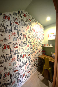 階段下のスペースは奥様のプライベートスペースへと生まれ変わりました。グリーンの壁紙をベースに落ち着きのある空間へ。