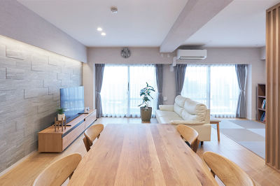 大人はダイニングで食事を、子どもたちは畳スペースでゲームなど。大勢がLDKに集まっても、それぞれ思い思いの場所で過ごせます。