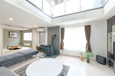 存在感のあるペレットストーブはリビングの主役。火を入れていなくてもインテリアとして空間にあたたかみを与えています。