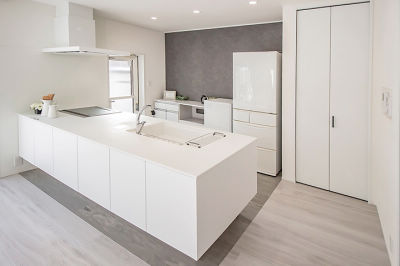 正面のグレーのアクセントクロスとホワイトオークの床に、真っ白なフロートタイプのキッチンが映えます。お子様たちがのびのび遊べる気持ちの良いLDKに。