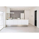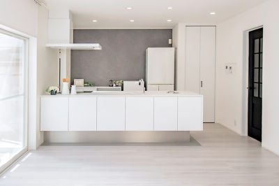 正面のグレーのアクセントクロスとホワイトオークの床に、真っ白なフロートタイプのキッチンが映えます。お子様たちがのびのび遊べる気持ちの良いLDKに。