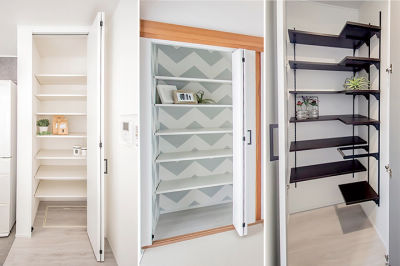 キッチン(左)と和室(中央)、玄関(右)に可動棚を増設。モノが片付きすっきりした空間に。