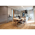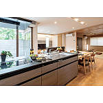 テラスの景色に癒されながら作業ができるオープンキッチン。ダイニングテーブルをキッチン横に配置し、配膳や後片付けをラクに。