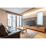 テレビの後ろの壁とテラスの壁は同じ石目調の壁材を採用。室内と屋外のつながりが生まれ、より開放感あふれる空間に。