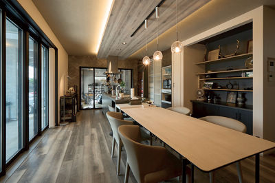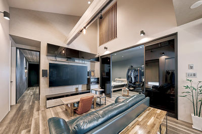 開放感のある勾配天井のリビング。隣接する書斎との間はスモークガラスの引き戸で仕切って、閉めていても視覚的な広がりを感じさせます。