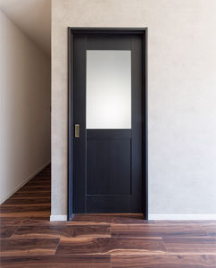 玄関からキッチンに入る扉はブラックオーク柄を選び、ウォールナット柄の床とコーディネイトして落ち着いた雰囲気に。
