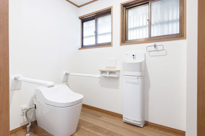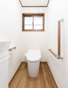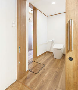 洋式トイレ・小便器のスペースはひとつにして、車いすでも入れる広さを確保。トイレ内に手洗いを設置してご両親の寝室側にも出入口を増やすことで、動線を改善しました。