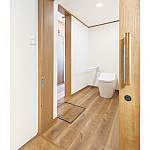 洋式トイレ・小便器のスペースはひとつにして、車いすでも入れる広さを確保。トイレ内に手洗いを設置してご両親の寝室側にも出入口を増やすことで、動線を改善しました。
