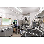 本格的な業務用設備を配置した離れのお菓子づくり工房。動線を考えて、作業しやすいようコンパクトに仕上げました。