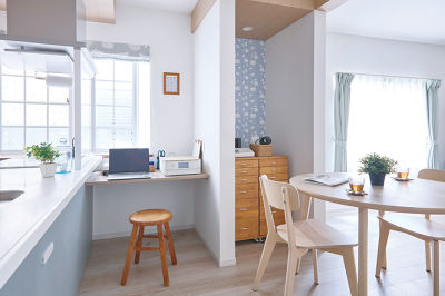 床下に断熱材を追加し、床暖房を採用して冬もあたたかい空間に。キッチン横にはパソコンスペースを設けました。
