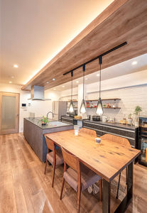 アイランドキッチンを主役にした開放的なLDK。木目柄でおしゃれな空間に仕上げました。