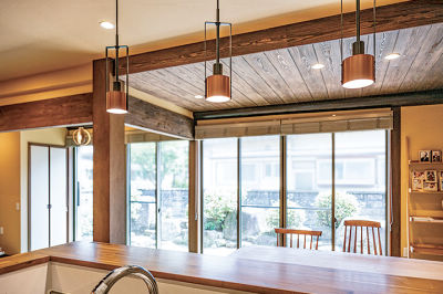 ふたつの和室と縁側をつなげて、広々としたリビングに、杉の羽目板や化粧梁をアクセントに、あたたかみのある空間になりました。