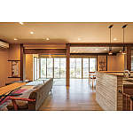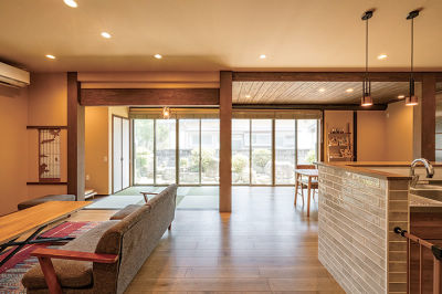 ふたつの和室と縁側をつなげて、広々としたリビングに、杉の羽目板や化粧梁をアクセントに、あたたかみのある空間になりました。