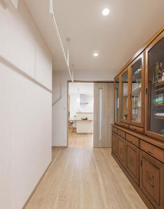 洗面室とキッチンをつなぐ納戸には、お母様の思い入れのある水屋箪笥を納めました。雨の日は室内干しスペースとしても活用。