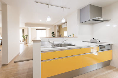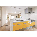 奥様のご希望で、キッチンはマンゴーイエローに。お母様が使いやすいようにカウンター高さは低めにしました。