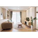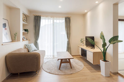 庭を眺めながらくつろげる明るいリビング。テレビボードはフロートタイプなので、お掃除もラク。