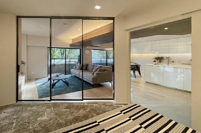 リビングと寝室の仕切りを、透明ガラスの引き戸にしたことで視界が広がり、ホテルのようなインテリアに。