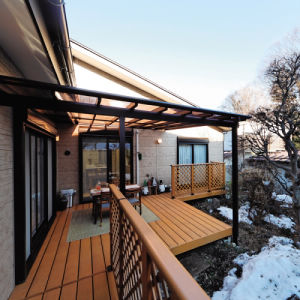 L字型に配置されたウッドデッキ。ダイニングを介して