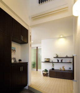 暗くなりがちな北向きの玄関は吹き抜けで明るく。