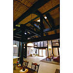 ダイニングから見た玄関側。2階および天井を取り去って現した建築当初の梁組みが、ダイナミックに当時の面影を伝えています。
