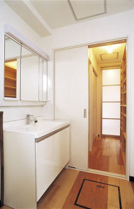 玄関からリビングへと続く動線とは別に、玄関からシューズルーム、洗面、バスルームへと続く