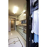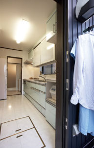 手前の物干しからキッチン、奥の洗面、浴室が一直線に。給湯、洗濯、調理、洗濯物干し等の家事を同時にこなせるから、作業効率も上がり、家事時間も短縮。