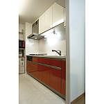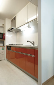 白とオレンジのツートンカラーが明るい印象のキッチン。
