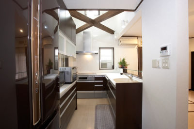 子育てに頑張る奥様へのご褒美にキッチンをリフォーム。増築部は吹き抜けとし、キッチンという舞台に立てば、高窓からスポットライトのように明るい光が降り注ぎます。天井には蓄光クロスを貼り、夜にあかりを消せば、星が浮かび上がってプラネタリウムのような夢の空間に。奥様の遊び心いっぱいの楽しいキッチンが生まれました。