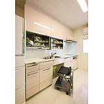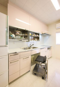電動昇降食器乾燥機や座るワゴンを備えた最新のキッチンで料理の負担を軽減しています